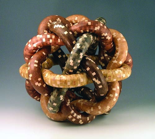 One end of the square-knot sculpture Martin’s Dream is primarily ebony; the other side, bird’s-eye maple. “There’s a mix of colors in the center of the knot,” says South Lake Tahoe artist Malcolm Tibbetts. “That’s where the strength is.”